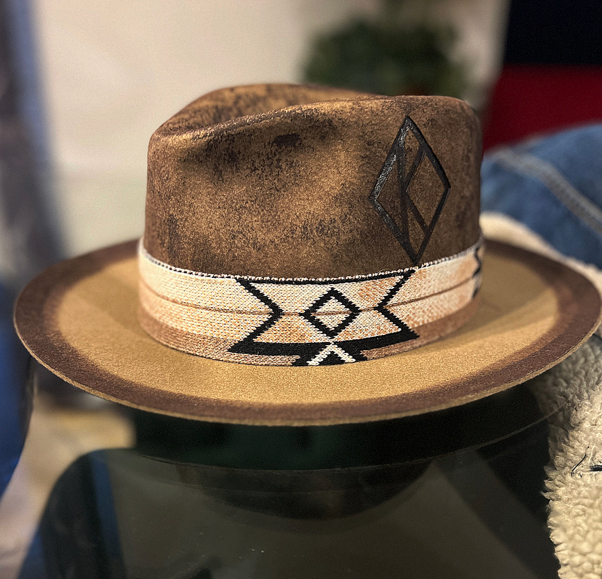 Floating K Fedora. One size with adjustable drawstring . 3 3/4” brim
