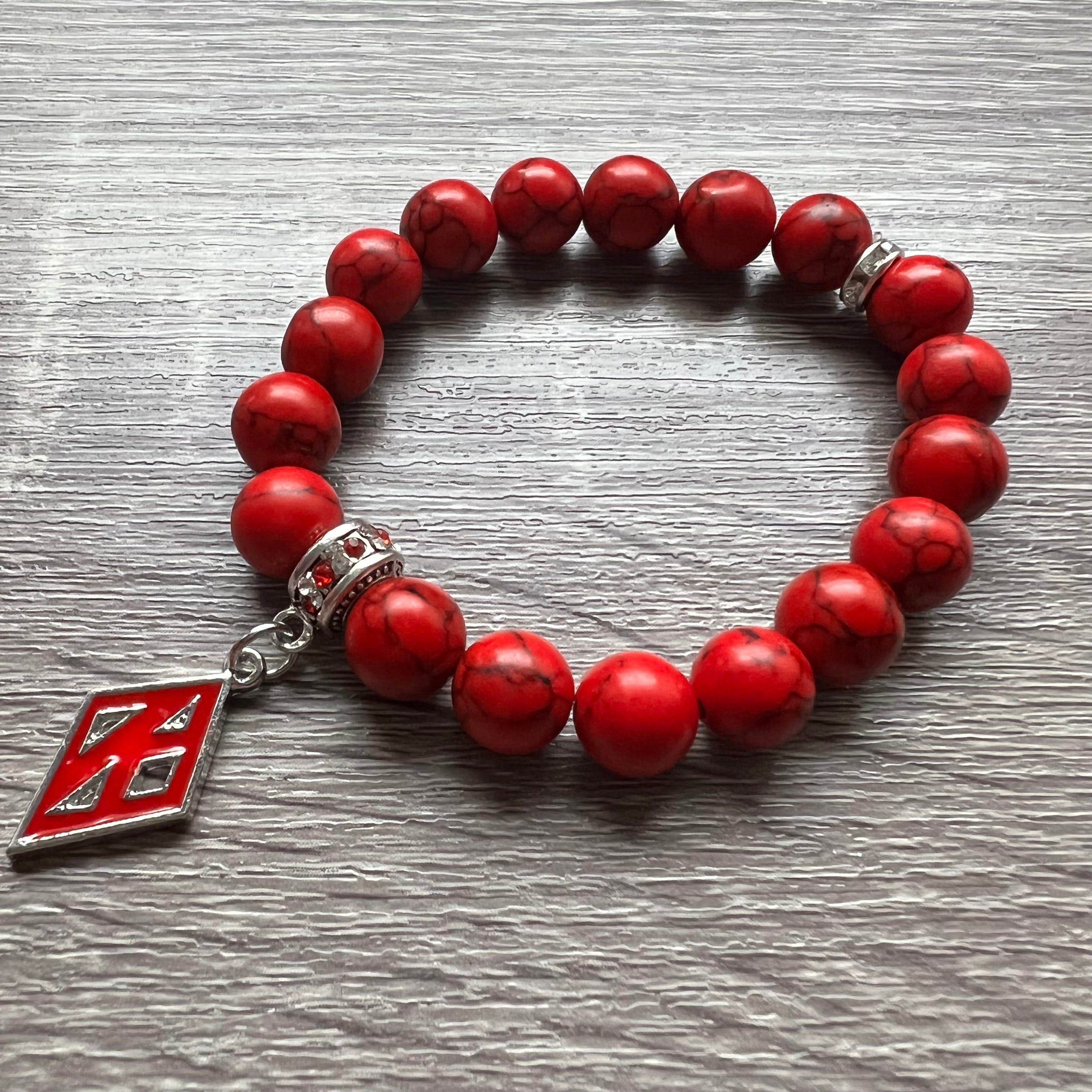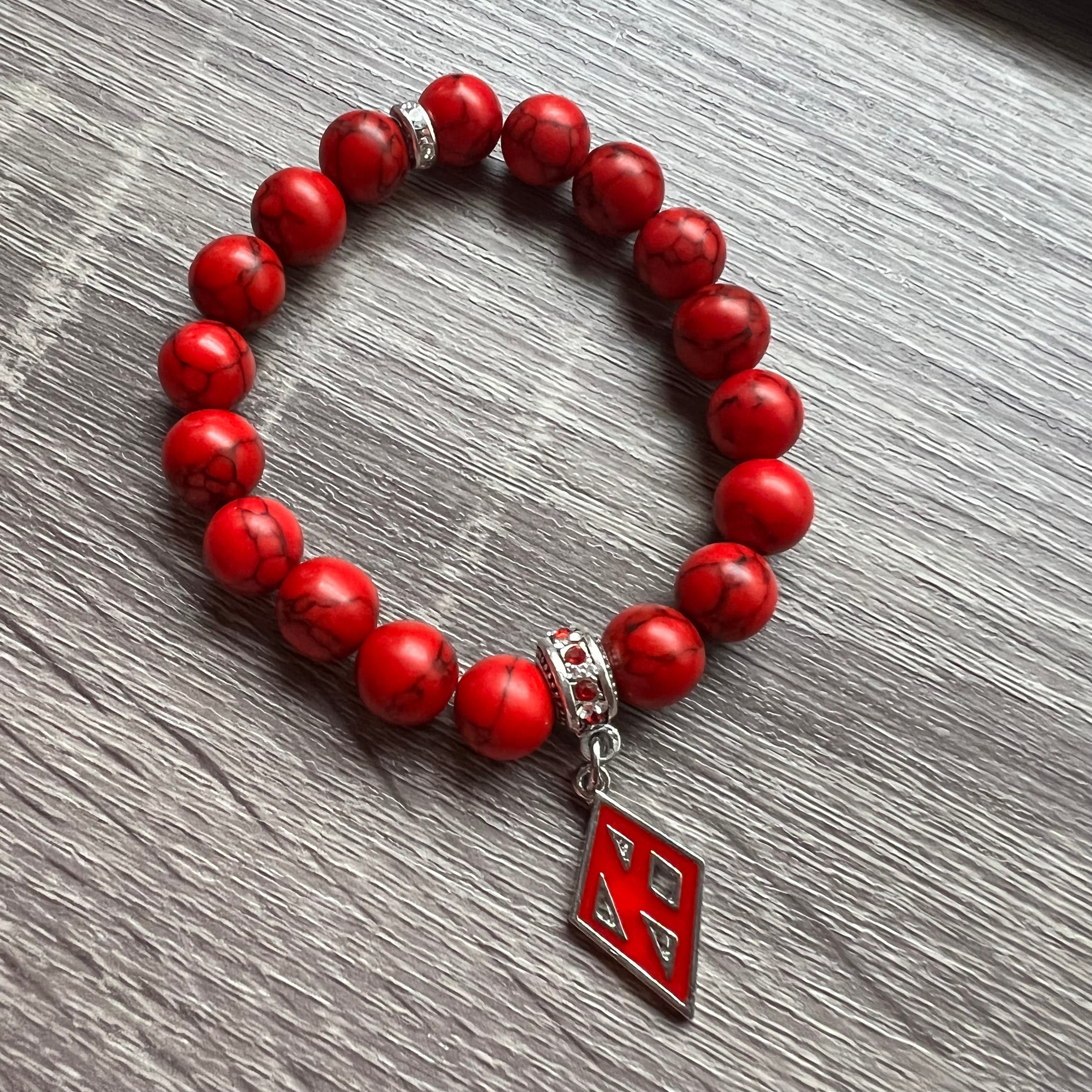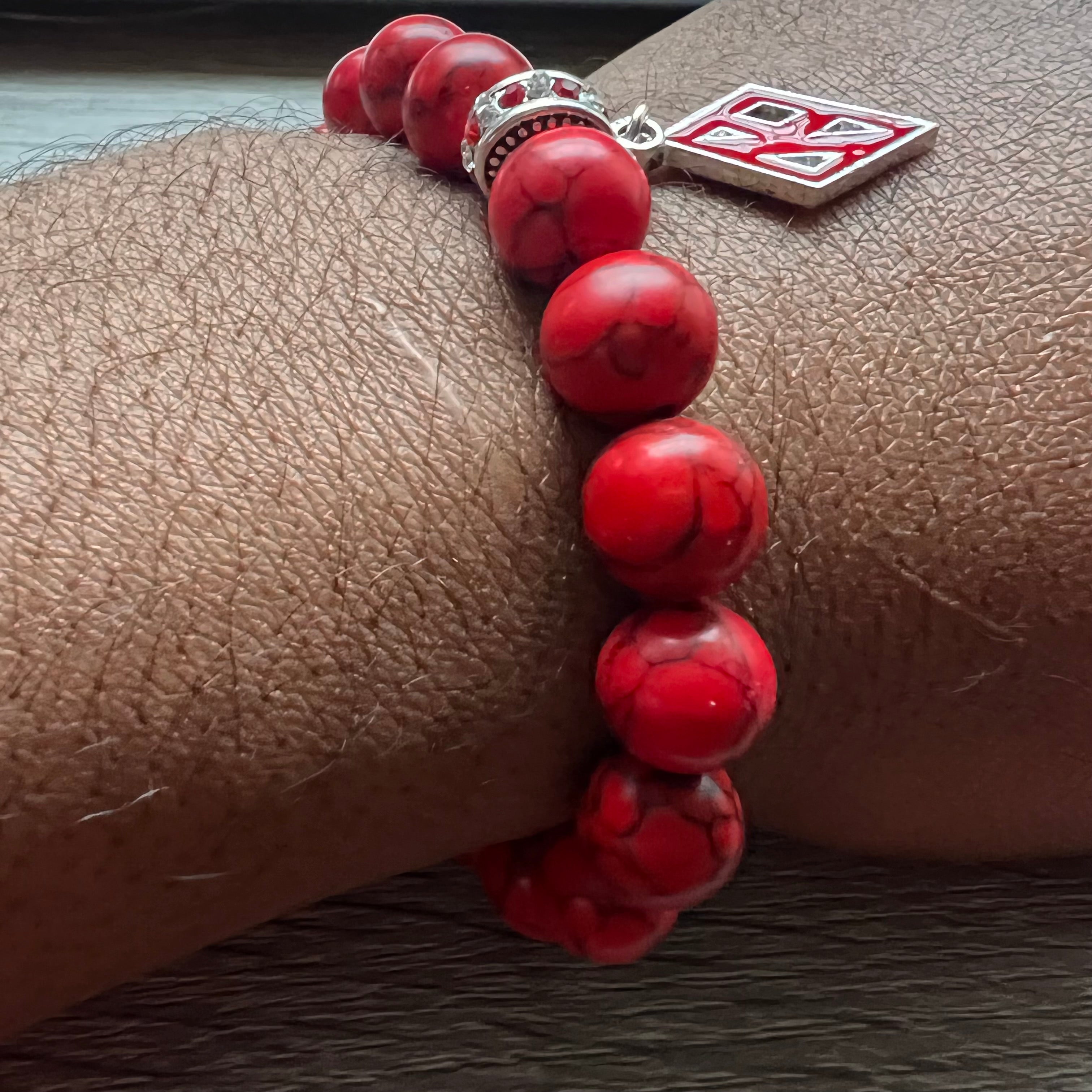 Kappa Alpha Psi fraternity exclusive Glass Beaded Bracelet on elastic stretch rope; simple and elegant. Easy bracelet to slide on and off wrist. The color of amber beads may vary from bracelet to bracelet due to each bracelet being hand made from natural materials with a personal touch.