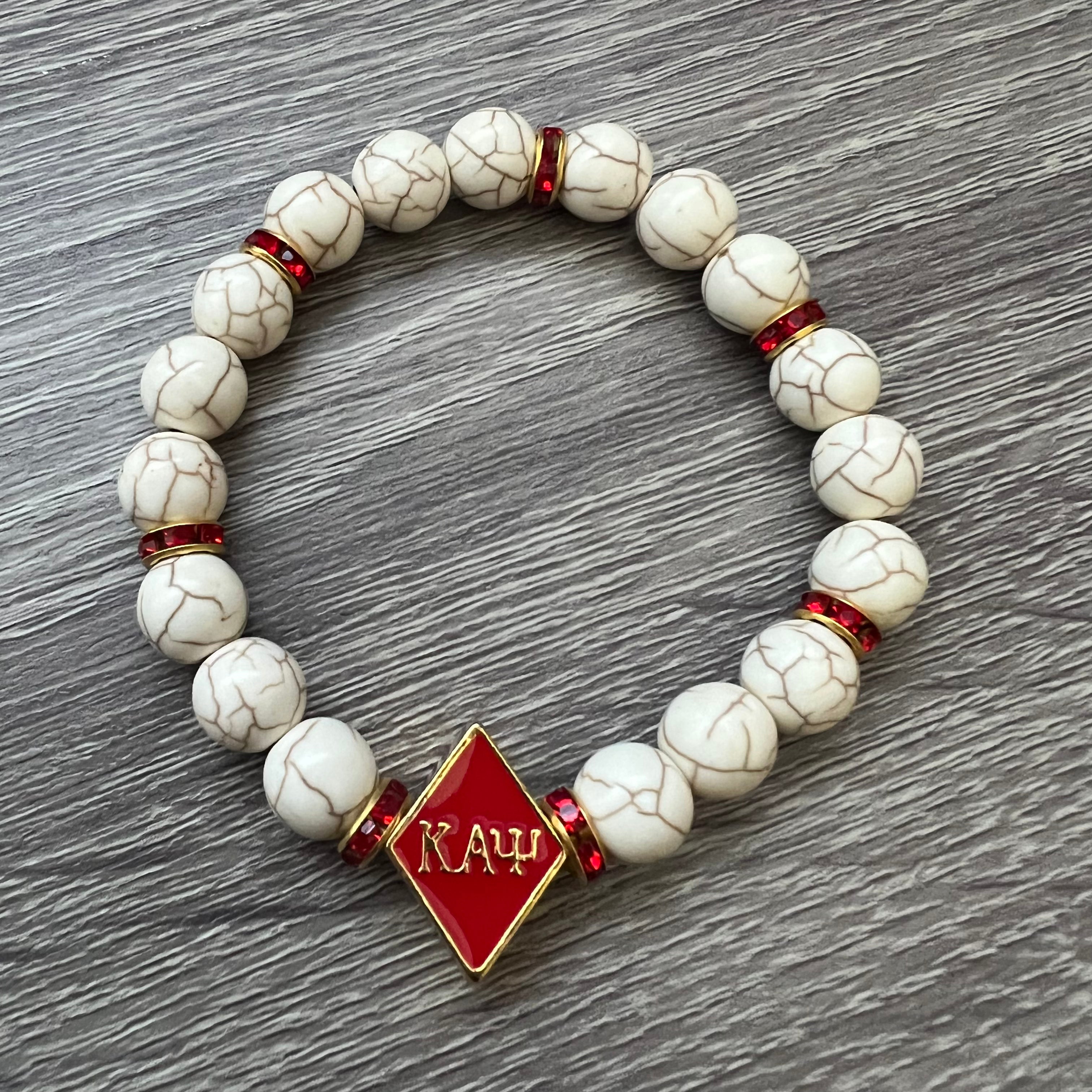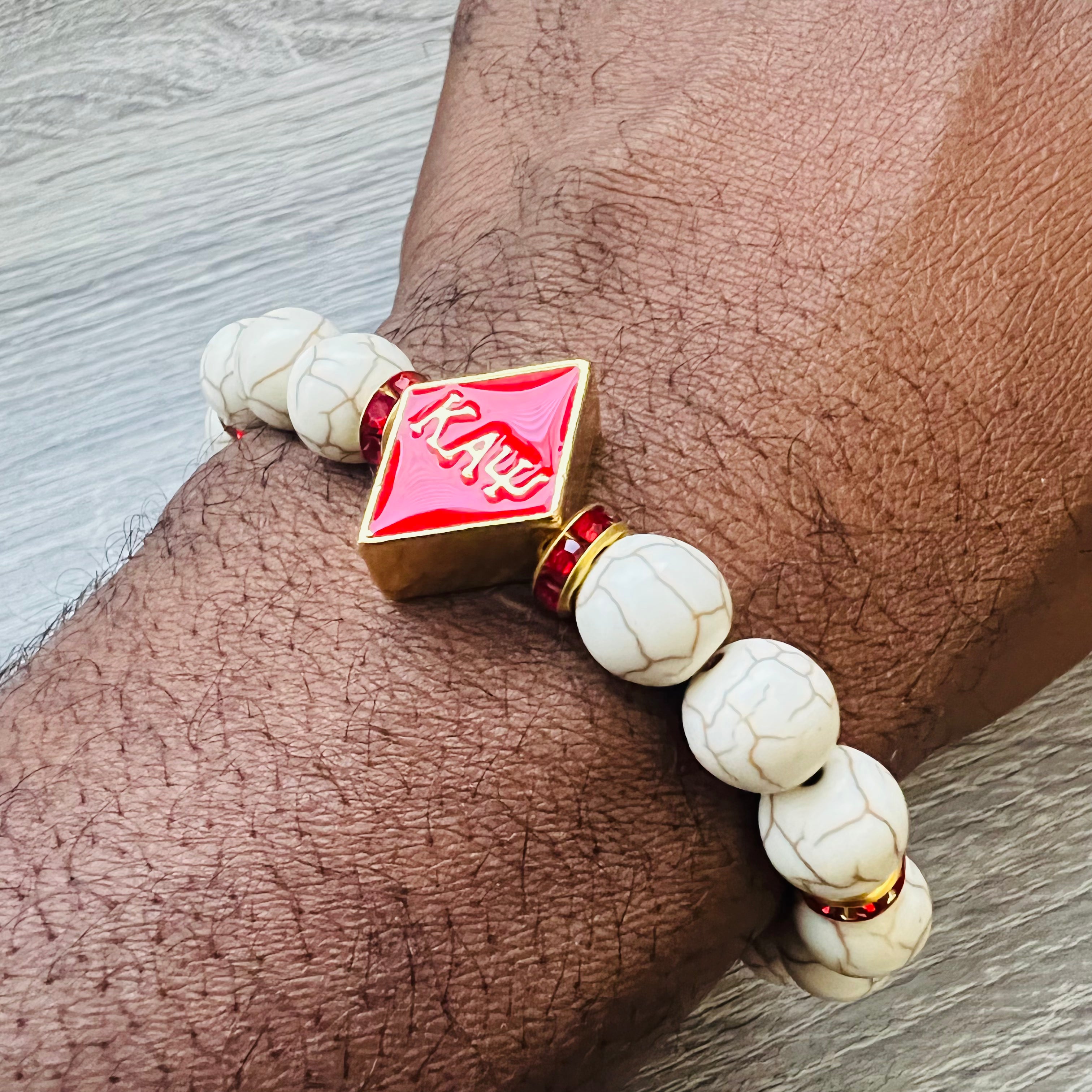 Kappa Alpha Psi fraternity exclusive Glass Beaded Bracelet on elastic stretch rope; simple and elegant. Easy bracelet to slide on and off wrist. The color of amber beads may vary from bracelet to bracelet due to each bracelet being hand made from natural materials with a personal touch.
