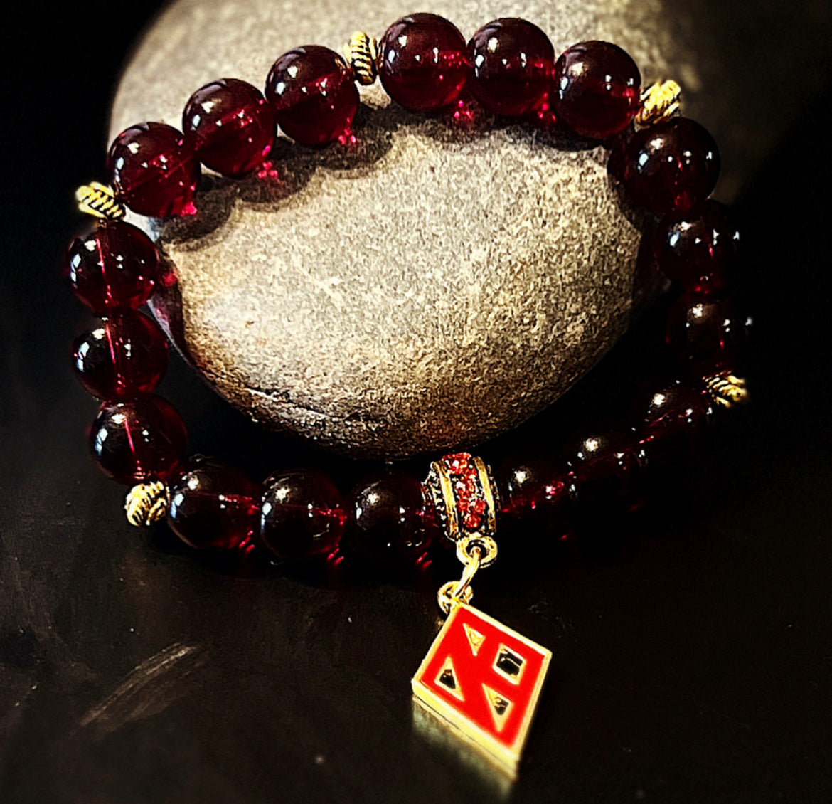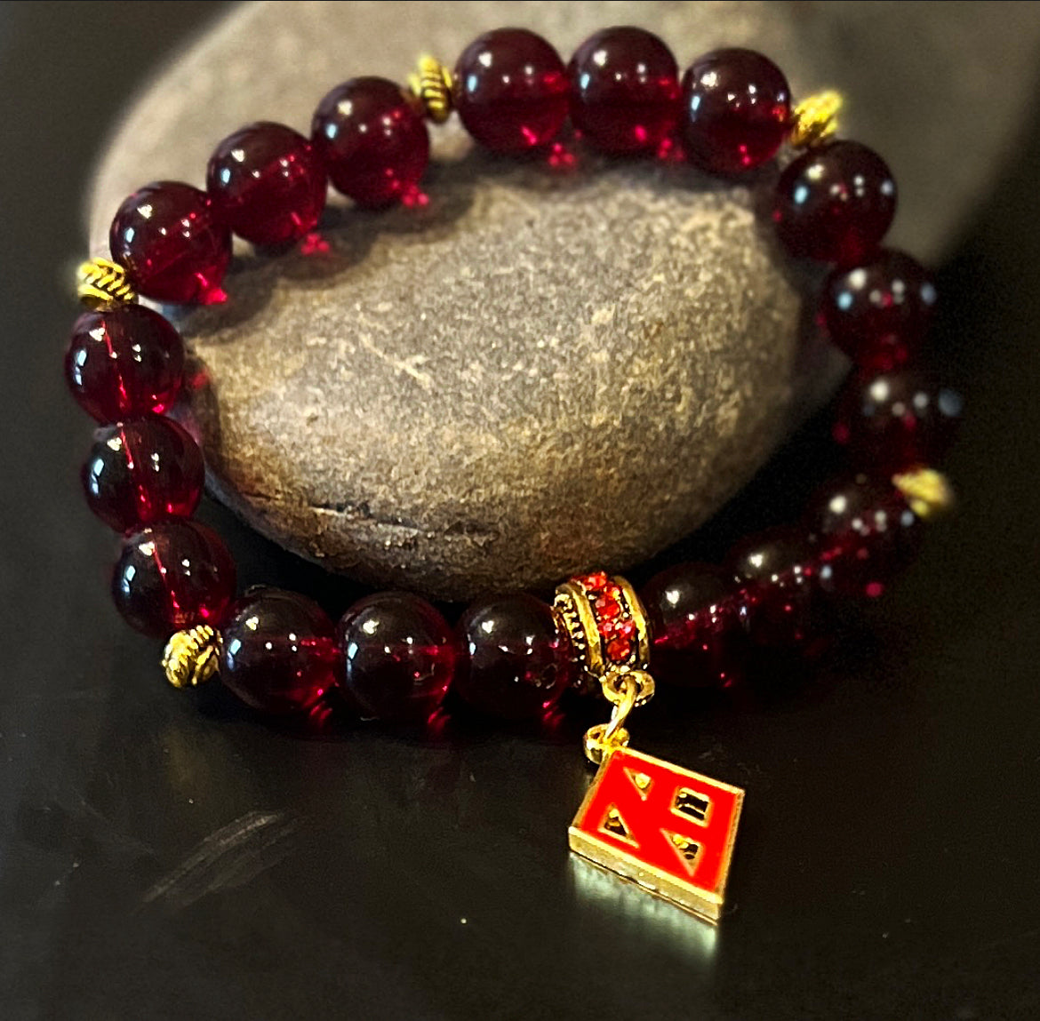 Kappa Alpha Psi fraternity exclusive Glass Beaded Bracelet on elastic stretch rope; simple and elegant. Easy bracelet to slide on and off wrist. The color of amber beads may vary from bracelet to bracelet due to each bracelet being hand made from natural materials with a personal touch.