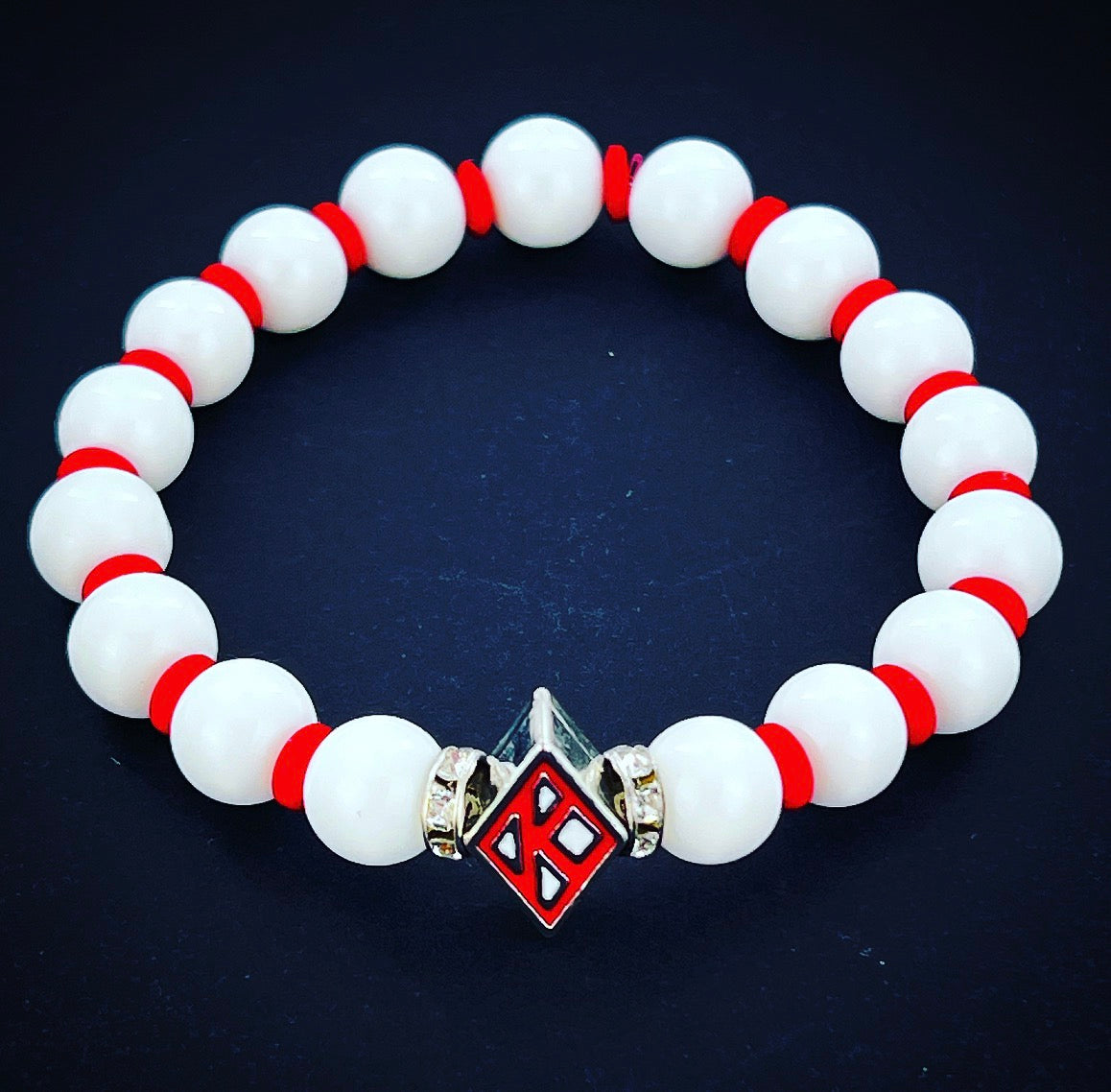Kappa Alpha Psi fraternity exclusive Glass Beaded Bracelet on elastic stretch rope; simple and elegant. Easy bracelet to slide on and off wrist. The color of amber beads may vary from bracelet to bracelet due to each bracelet being hand made from natural materials with a personal touch.