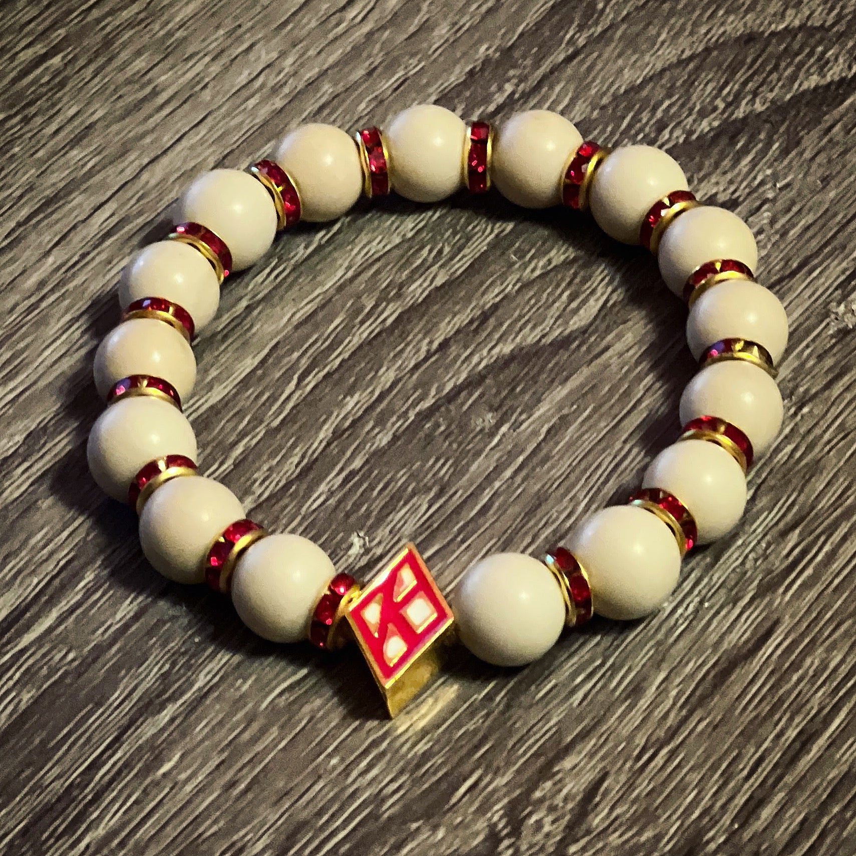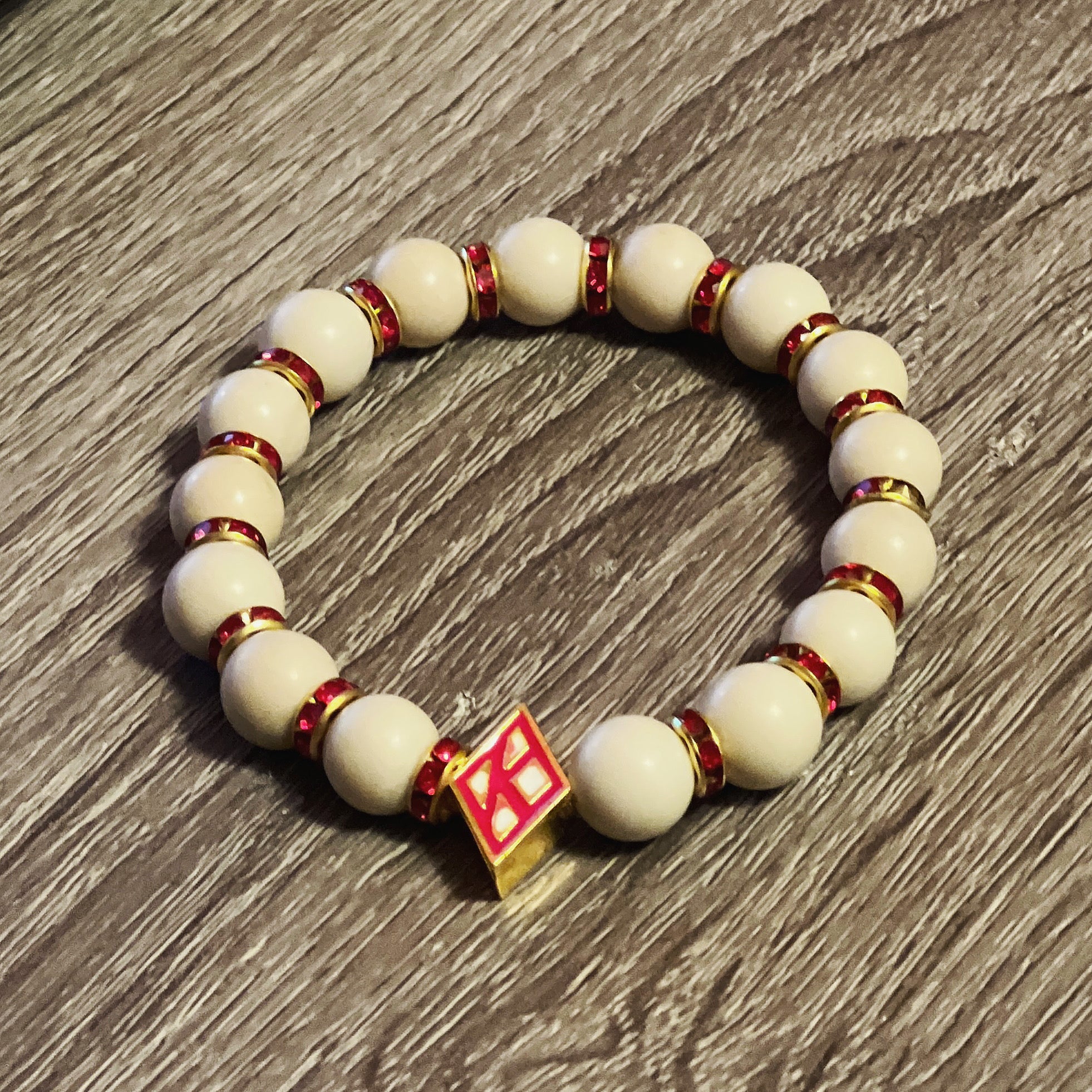 Refresh availabilityKappa Alpha Psi fraternity exclusive Glass Beaded Bracelet on elastic stretch rope; simple and elegant. Easy bracelet to slide on and off wrist. The color of amber beads may vary from bracelet to bracelet due to each bracelet being hand made from natural materials with a personal touch.