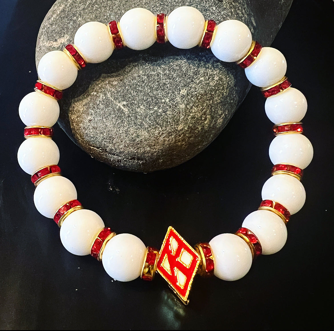Refresh availabilityKappa Alpha Psi fraternity exclusive Glass Beaded Bracelet on elastic stretch rope; simple and elegant. Easy bracelet to slide on and off wrist. The color of amber beads may vary from bracelet to bracelet due to each bracelet being hand made from natural materials with a personal touch.