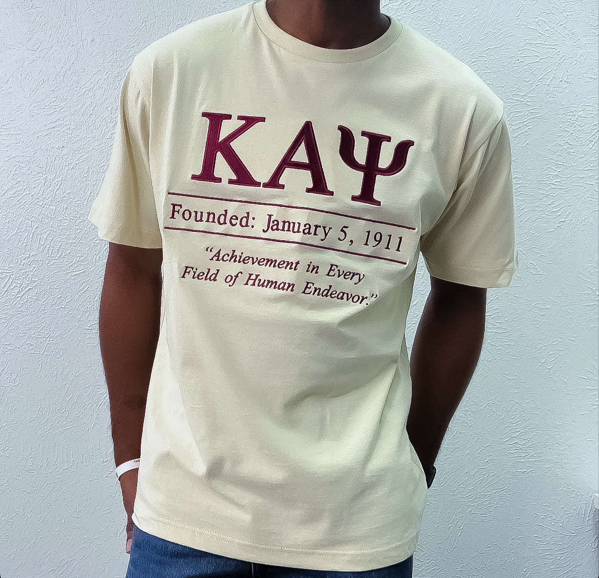 Show off your Kappa Alpha Psi pride with this stunning Embroidery and Chenille Shield T Shirt in Cream and Crimson colors. Perfect for members and supporters of the Fraternity & Organization, this shirt is a must-have for any fan of historical memorabilia.